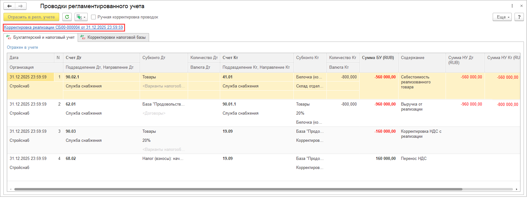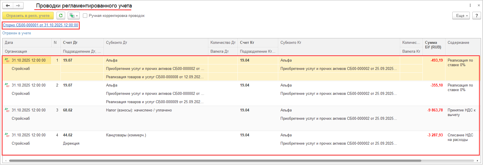 С целью обеспечения неизменности сформированных бухгалтерских проводок после выполнения процедуры Закрытие месяца реализовано формирование проводок по включению НДС в стоимость товаров (исключению НДС из стоимости) для отдельного регламентного документа.