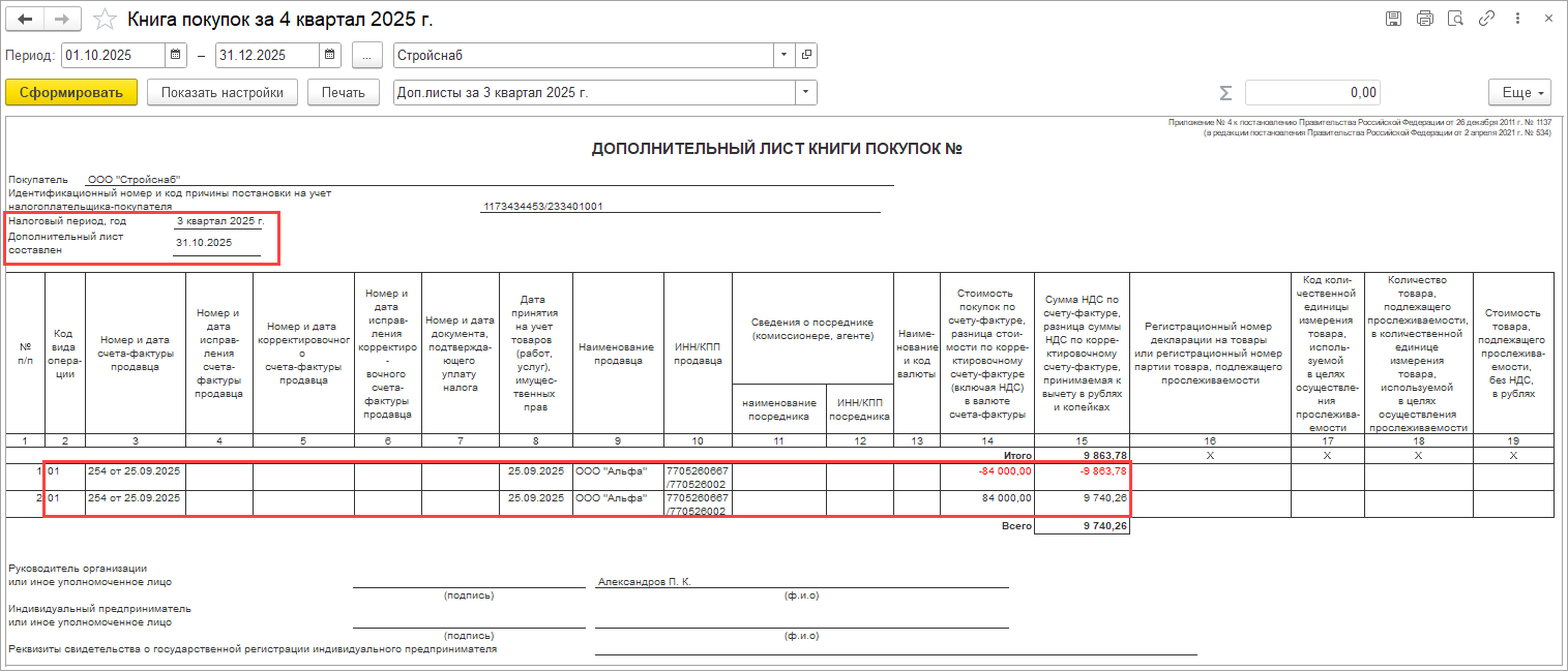 Если, например, во втором квартале были исправления приобретений первого квартала и затем в третьем квартале вводится исправление базы распределения НДС первого квартала, то следует учесть, что исправления второго квартала могли распределиться по базе первого (см. отчет Анализ распределения НДС за 2 кв.). В таком случае следует дополнительно ввести исправление распределения НДС второго квартала, чтобы исправления приобретений распределились по правильной базе.