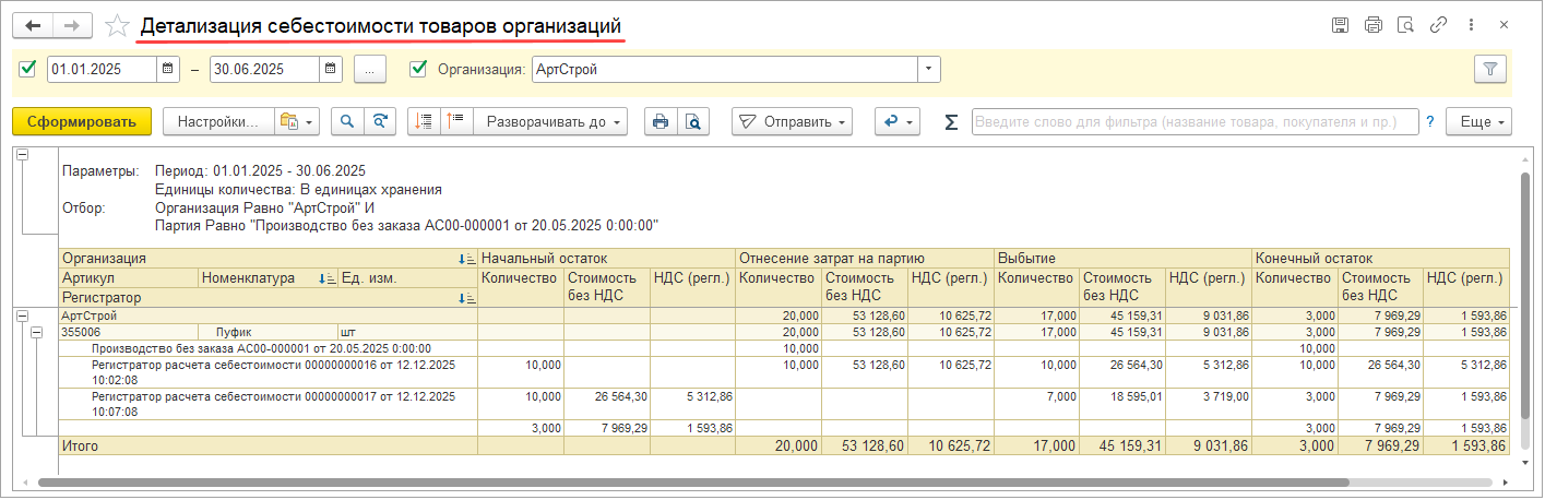 Детализация распределения партий исходных затрат |