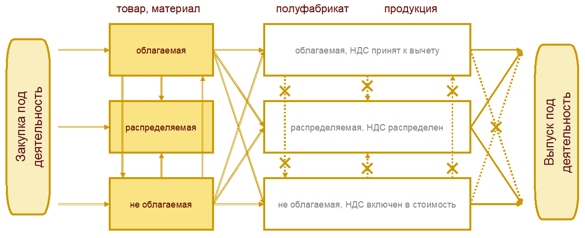 Ограничения изменения вида деятельности НДС при выключенной настройке Детализировать себестоимость продукции до исходных затрат приведены на схеме.