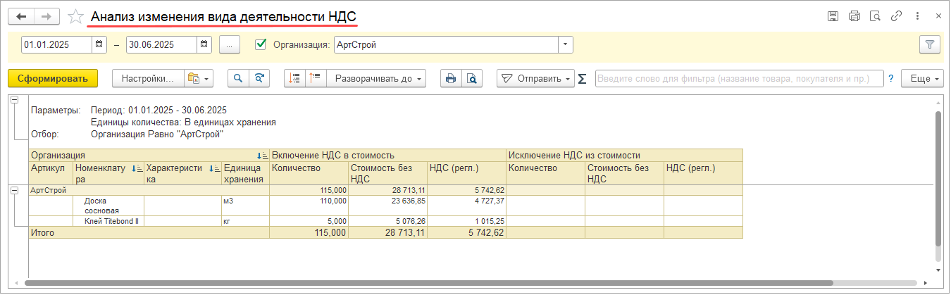 Для контроля и анализа изменений вида деятельности НДС для полуфабрикатов и продукции добавлен отчет Анализ изменения вида деятельности НДС (меню Финансовый результат и контроллинг – Отчеты по финансовому результату – Себестоимость запасов). Отчет может применяться при использовании организацией метода оценки стоимости Среднескользящая или Средняя за месяц.