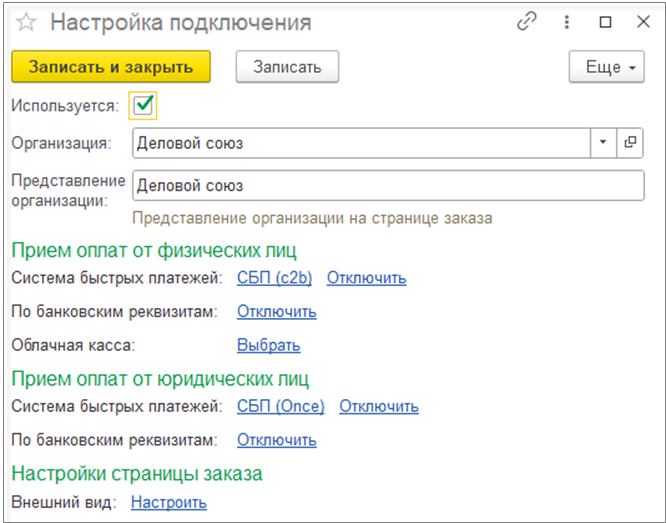 Подключение онлайн-заказов настраивается в разделе НСИ и администрирование – Администрирование - Интернет-поддержка и сервисы - Онлайн-заказы - гиперссылка Настройки страниц. В открывшемся окне необходимо нажать на кнопку Создать и выбрать настройки СБП для c2b и b2b переводов, если существуют настройки подключения СБП.