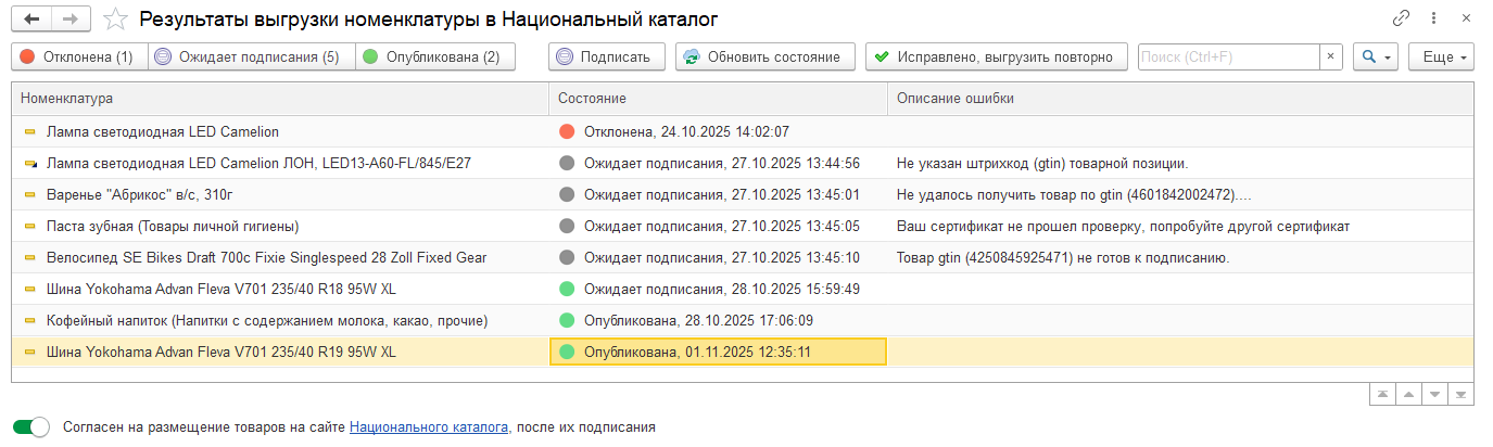 Эти статусы отображаются в нижней части формы Выгрузка данных номенклатуры и в форме Результаты выгрузки номенклатуры в Национальный каталог. Статус Принята соответствует как карточкам, ожидающим подписания в личном кабинете национального каталога, так и подписанным и опубликованным карточкам.