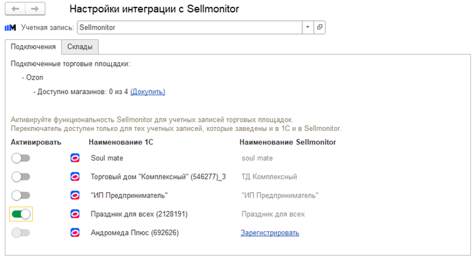Далее выполняется настройка интеграции Sellmonitor для учетных записей торговых площадок. В форме Настройка интеграции с Sellmonitor на закладе Подключения выводится список настроенных учетных записей торговых площадок с переключателями, позволяющими активировать функции Sellmonitor для соответствующей записи, а также общая информация по подключенным торговым площадкам. Учетные записи торговых площадок, заведенные в 1С и в Sellmonitor, сопоставляются автоматически. Если соответствующая учетная запись не найдена в Sellmonitor, то отображается ссылка Зарегистрировать.