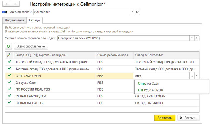 При включенном сервисе аналитики Sellmonitor в таблицах сопоставления складов информационной базы и торговой площадки в форме настройки обмена данными для учетной записи торговой площадки дополнительно настраивается соответствие складов для Sellmonitor.