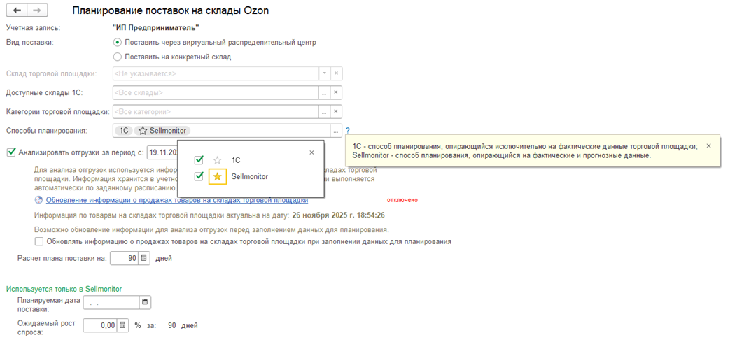 При работе по схеме FBO планирование поставки при подключенной интеграции с сервисом Sellmonitor может выполняться следующими способами: