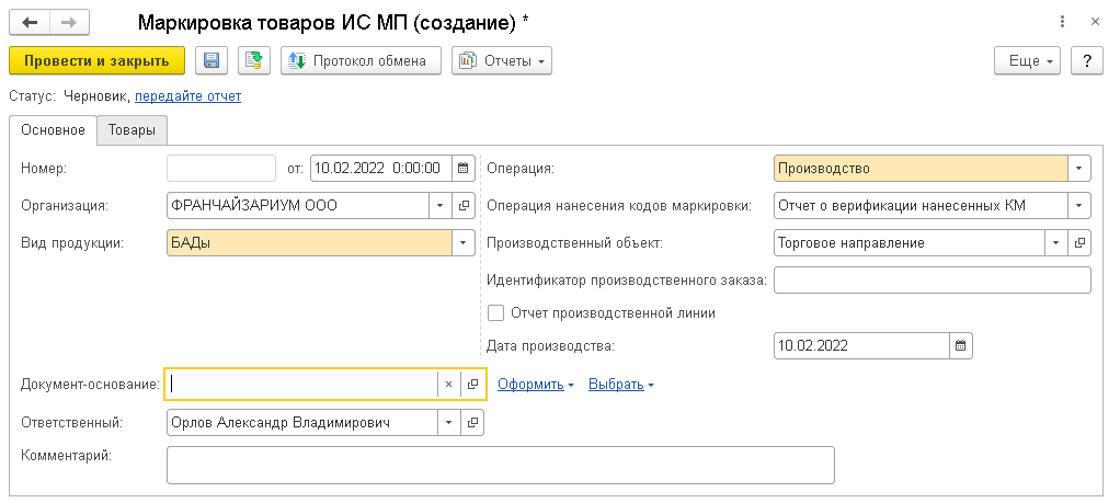 После фактического нанесения кодов маркировки на продукцию необходимо передать Отчет о верификации нанесенных КМ, для чего требуется оформить документ Маркировка товаров ИС МП в рабочем месте Обмен с ИС МП. Документ можно создать вручную или оформить автоматически по ранее отраженному документу производства или приобретения продукции. В документе обязательно указывается дата и время производства.