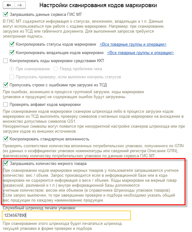 Флаг в форме подбора и проверки маркируемой продукции устанавливается по умолчанию, если в форме В настройках администрирования НСИ и администрирование – Администрирование – Интеграция с ИС МП (обувь, одежда, табак…) – Настройки сканирования кодов маркировки установлен флаг Запрашивать количество мерного товара.