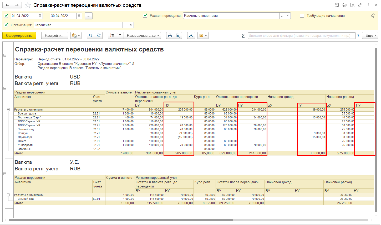 Для контроля и анализа результатов переоценки в налоговом учете отчет Справка – расчет переоценки валютных средств дополнен колонками НУ.