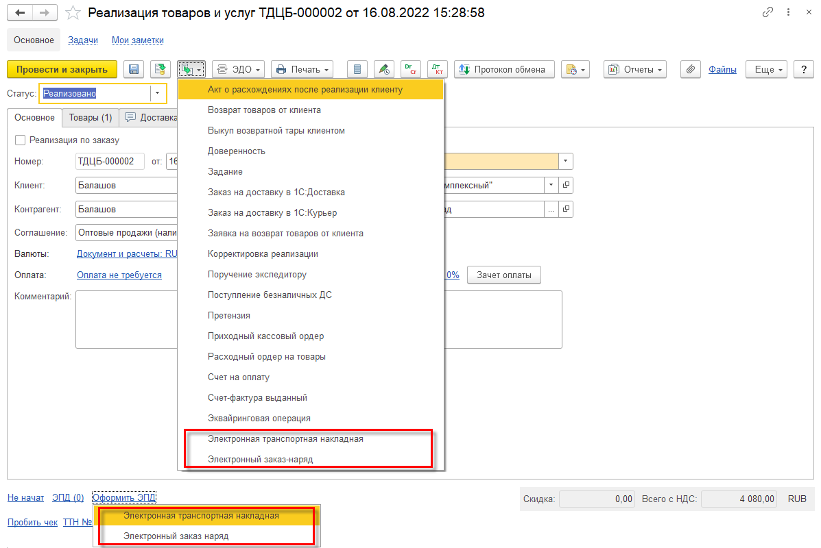 Создать ЭПД можно из формы документа или списка по команде Создать на основании, выбрав соответствующий вид документа: