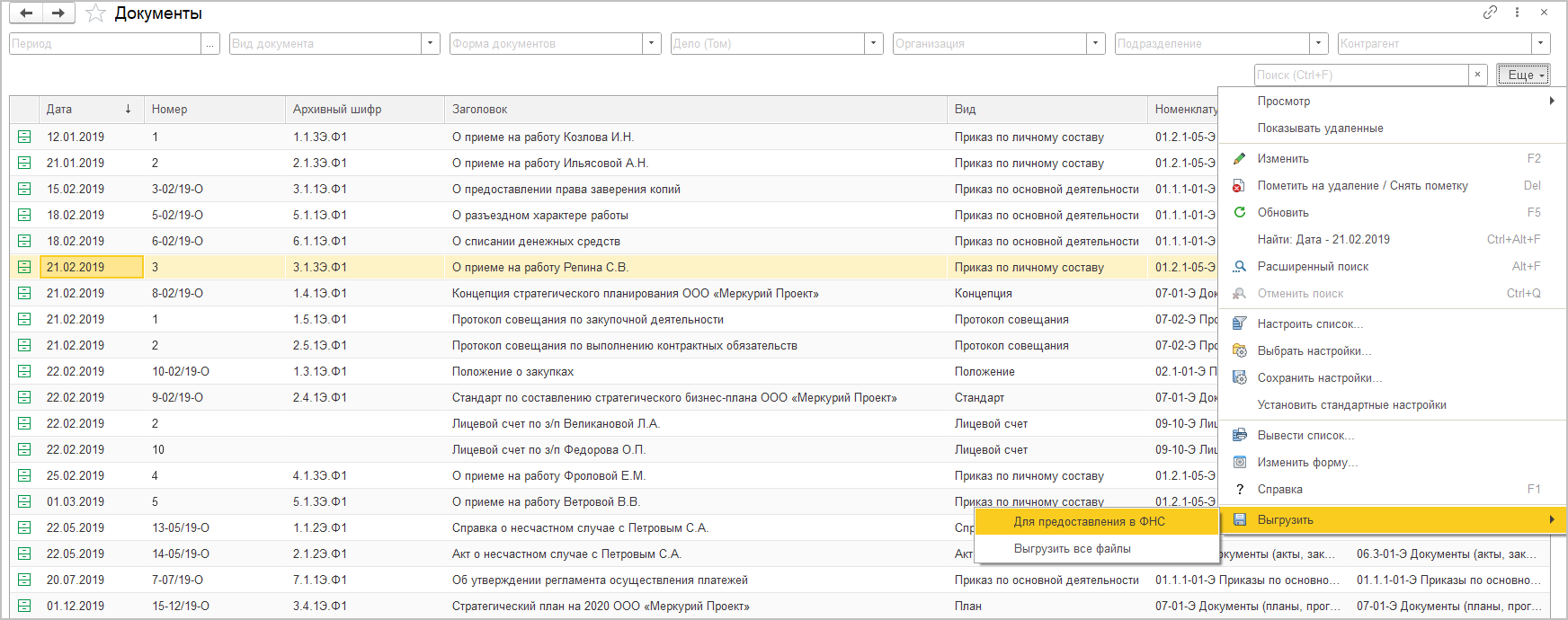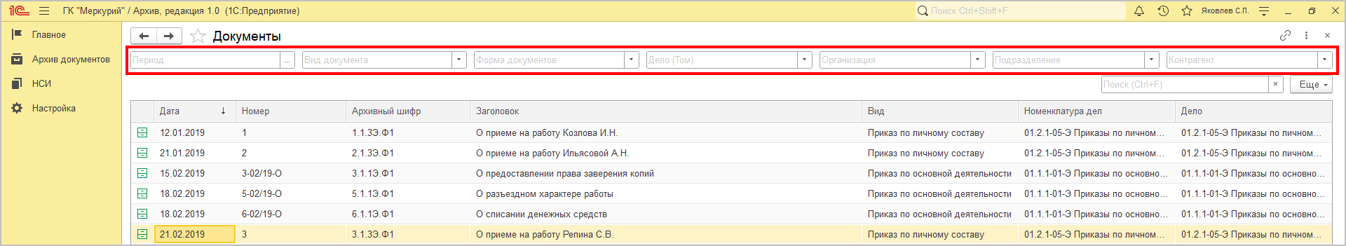 В новой версии программы в списке Документы архива появились быстрые отборы: по периоду, виду документа, форме документа, делу (тому), организации, подразделению, контрагенту.