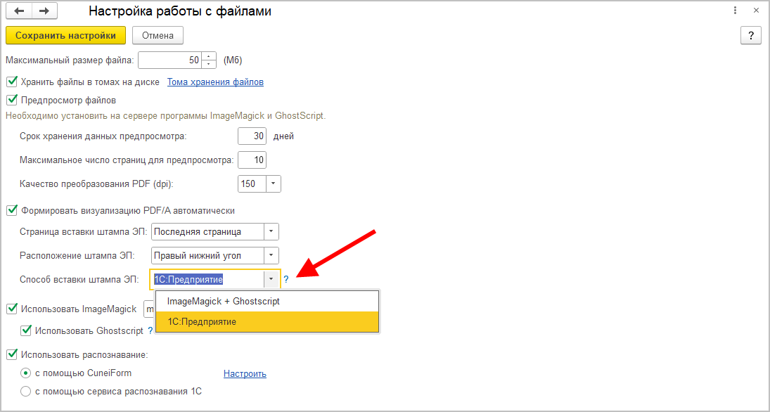 Для этого в настройках файлов предусмотрена настройка Способ вставки штампа ЭП.