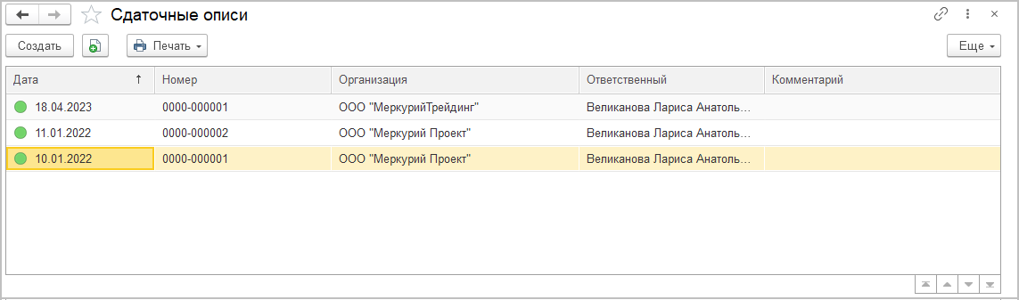 Теперь в списке Сдаточные описи отображаются статусы описей и пакетов: