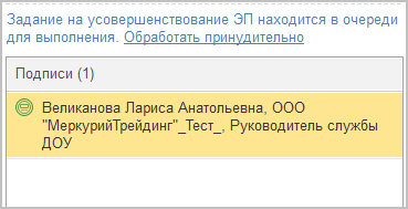 При этом в карточке документа выводится надпись об отложенном выполнении операции и кнопка Обработать принудительно.