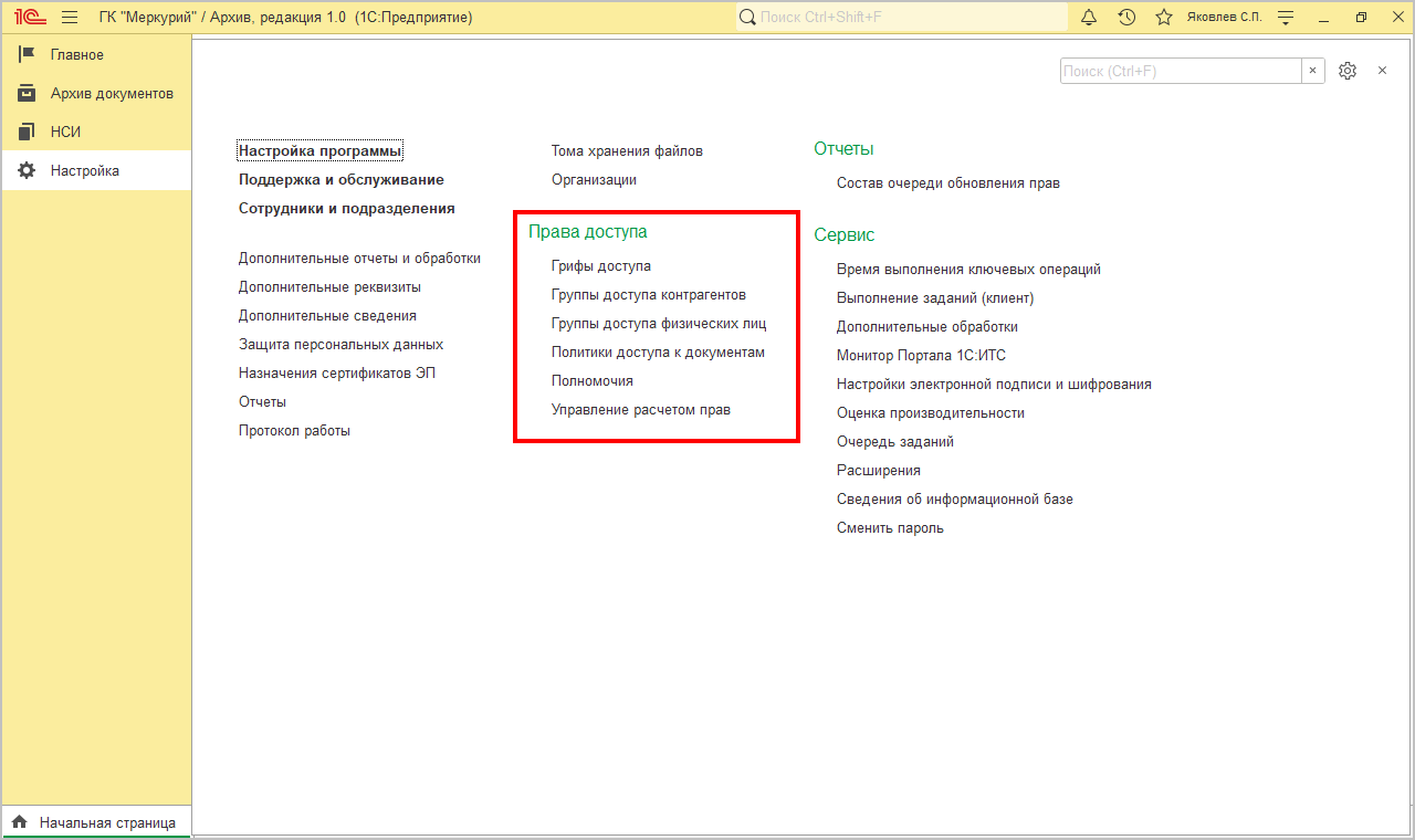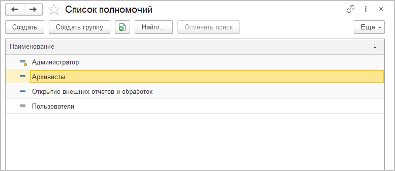В «1С:Архиве» настроены четыре поставляемых полномочий: