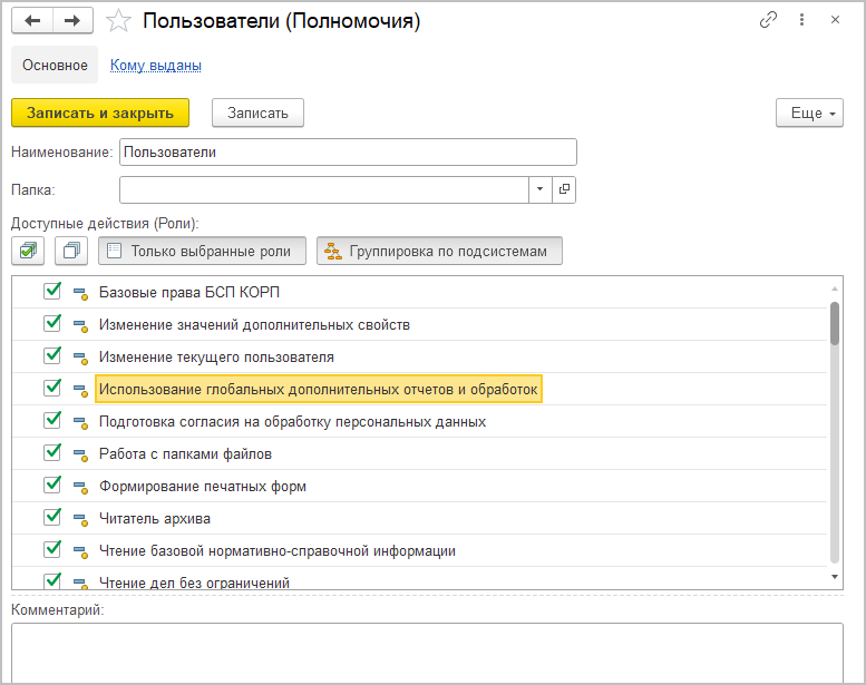 Полномочия – это готовая подборка ролей с правами на доступ к данным. При наличии большого количества сотрудников с однотипным доступом полномочия позволяют удобно структурировать роли согласно должностным инструкциям сотрудников.