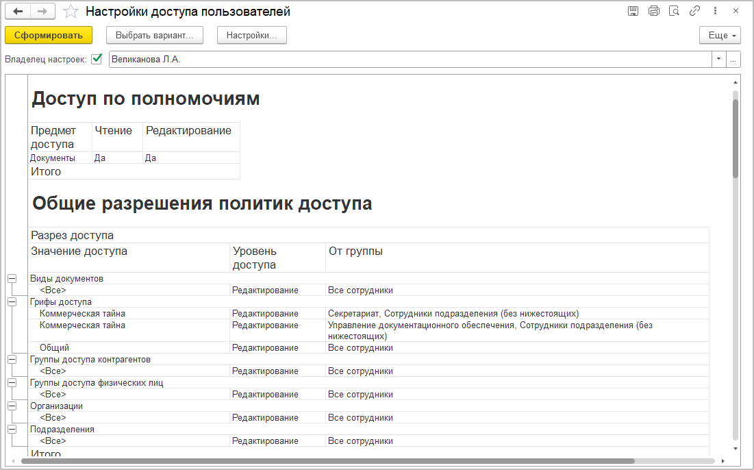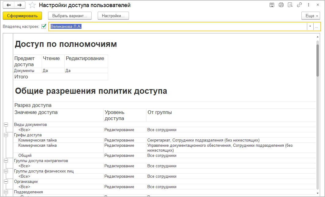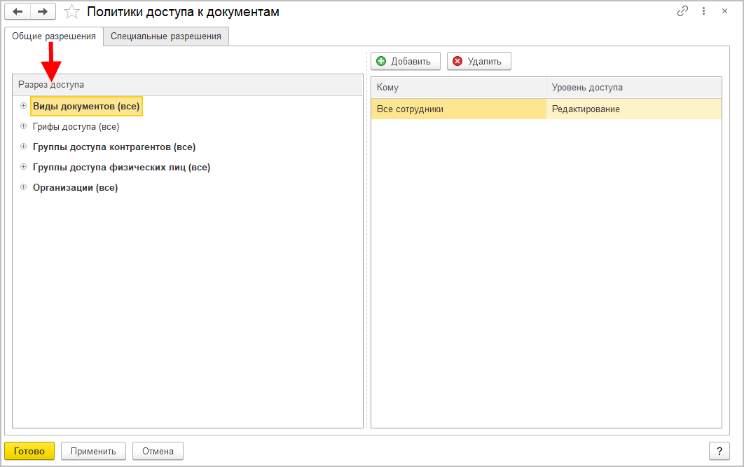 С помощью политик доступа можно задать как общие настройки прав для рабочих групп и подразделений, так и доступ к данным, которые ссылаются на определенный вид документа, конкретному сотруднику.