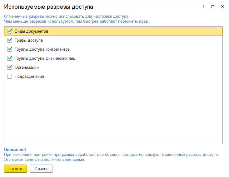 Изменение состава используемых разрезов может привести к длительным пересчетам прав. Рекомендуется менять эту настройку только на начальном этапе эксплуатации программы.