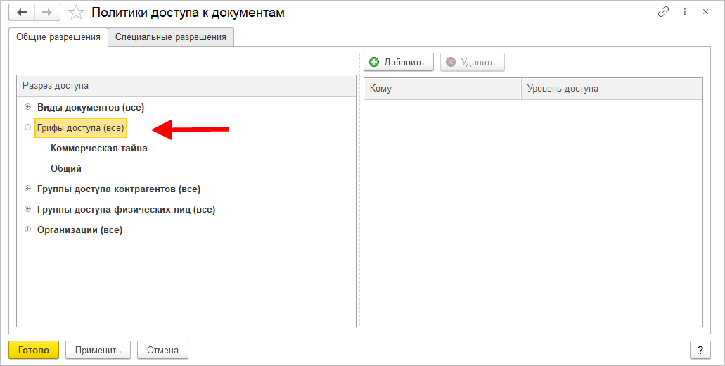 Шаг 2. Общие разрешения работают следующим образом: доступ к документу дается пользователю, у которого есть доступ ко всем разрезам доступа объекта: организации, грифу и т. д.