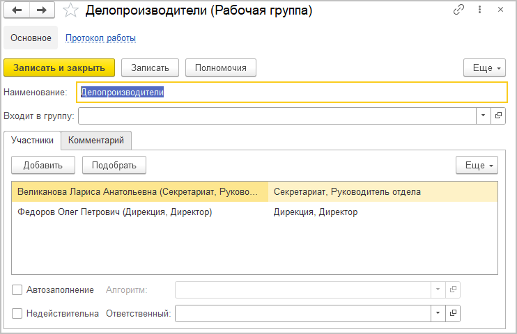 Пометка Недействительна не меняет прав сотрудников, входящих в рабочую группу, но запрещает менять их состав и скрывает группу в списках и адресной книге. Если администратор считает, что эта рабочая группа все же нужна, пометку можно снять и пользоваться ей, как раньше.