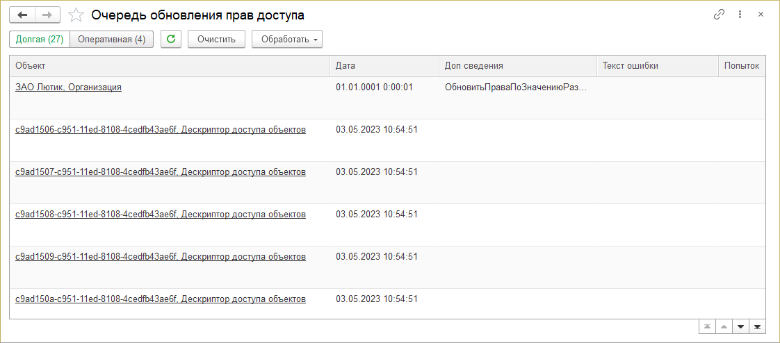 Обработка очереди выполняется автоматически регламентными заданиями Обновление прав доступа (долгое) и Обновление прав доступа (оперативное). Если это регламентное задание отключено, то очередь можно обработать вручную при помощи команд подменю Обработать.
