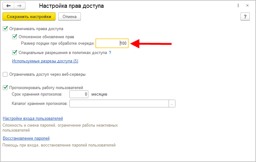 Например, при изменении политик доступа к документам запустится пересчет прав всех документов. Это может занять длительное время, на протяжении которого вы не сможете продолжить работу с программой. С отложенным обновлением прав работа в программе не прервется: задание на пересчет прав документов будет помещено в очередь.