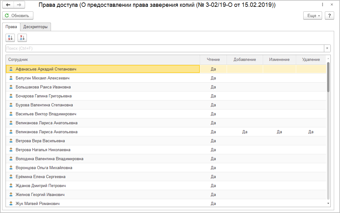 Вся система расчета прав «1С:Архива» построена на дескрипторах доступа.