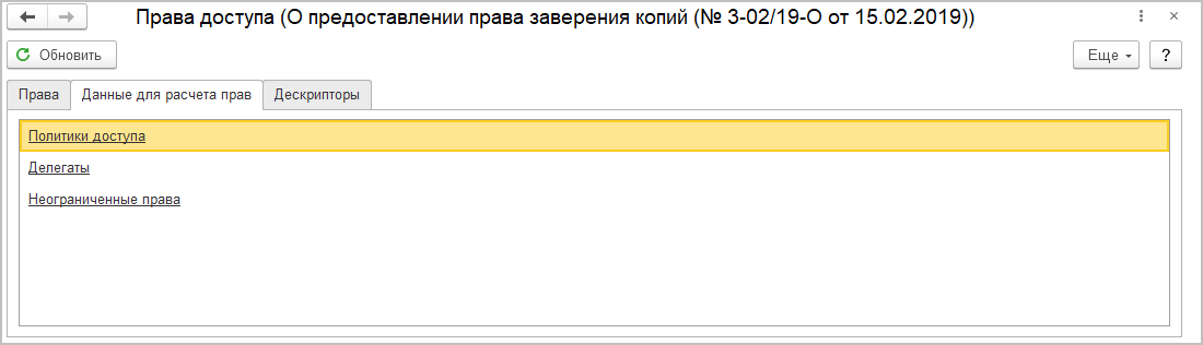 Кнопка Обновить запускает немедленное обновление и пересчет прав объекта. При этом появится закладка Данные для расчета прав со списком сведений, использованных для расчета прав (доступна только для администратора).