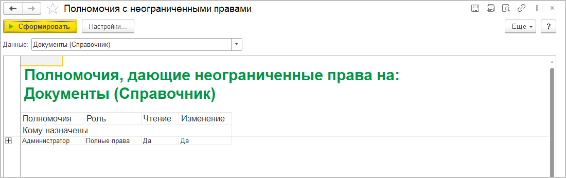 Этот отчет и отчет Полномочия с неограниченными правами можно открыть и из панели отчетов раздела Настройка и администрирование.