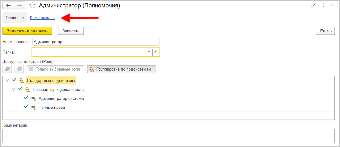 Напомним: неограниченные права, назначенные полномочиями, нельзя ограничить никакими другими настройками прав (папками, рабочими группами и т. д.).