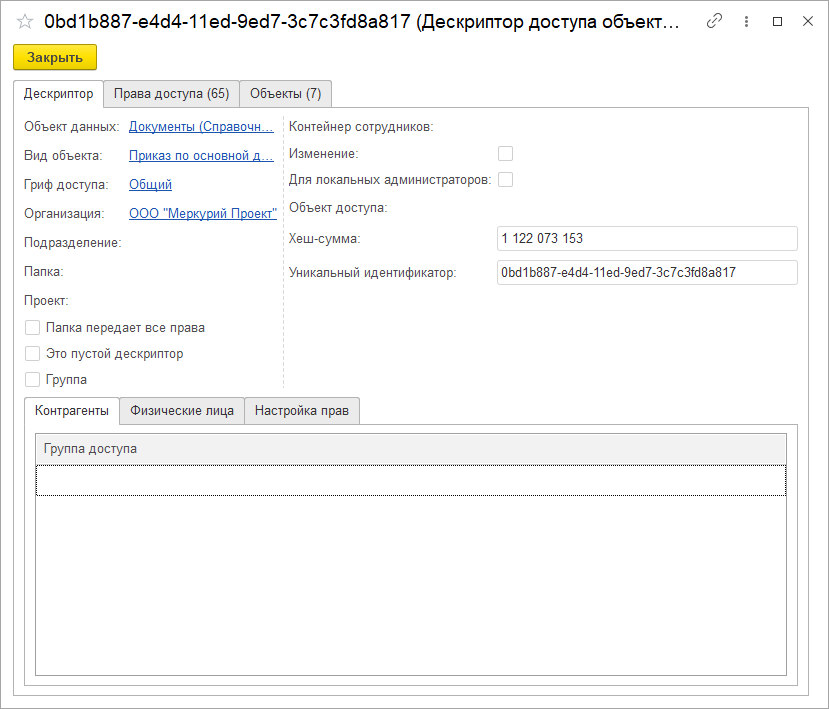 Дескриптор создается автоматически для нескольких объектов информационной базы и группирует ключевые поля, влияющие на расчет прав этих объектов (гриф доступа, вид документа, папка и др.) Это позволяет рассчитывать права не для каждого объекта программы, а сразу для нескольких.