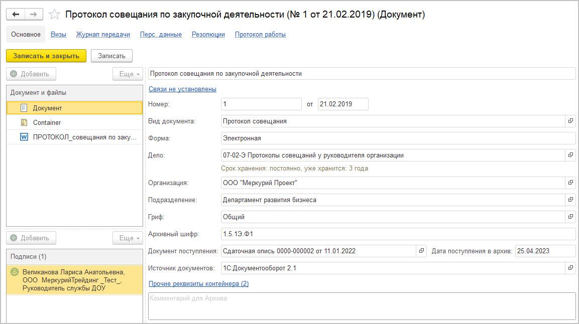Для нового документа архива доступно редактирование всех реквизитов, в том числе Прочих реквизитов контейнера и персональных данных.