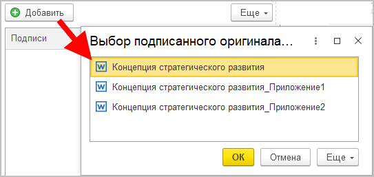 В карточке документа архива в группе Подписи необходимо выполнить команду Добавить. При этом откроется список оригиналов документов, к которым относится загружаемый файл ЭП.