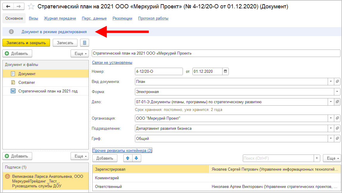 В режиме редактирования все реквизиты, персональные данные и файлы документа доступны для изменения. На закладке Визы предусмотрено добавление виз и резолюций.