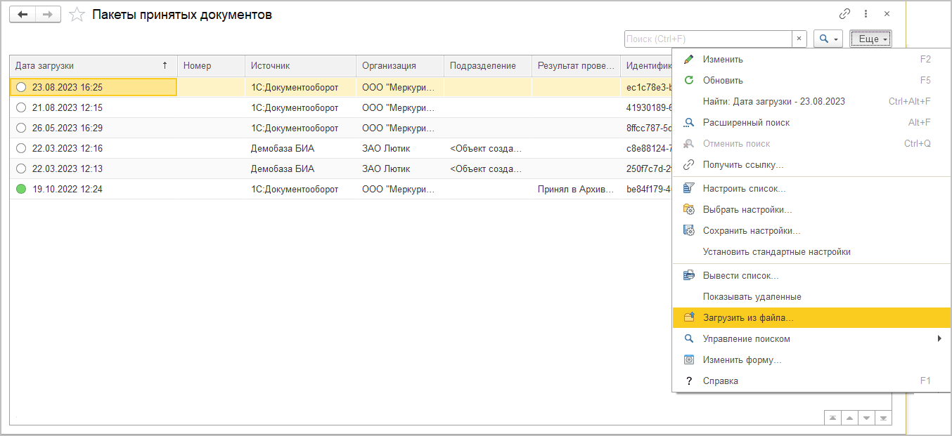В новой версии программы можно вручную загрузить пакет документов из файла. Для этого в меню Еще списка принятых документов предусмотрена команда Загрузить из файла.