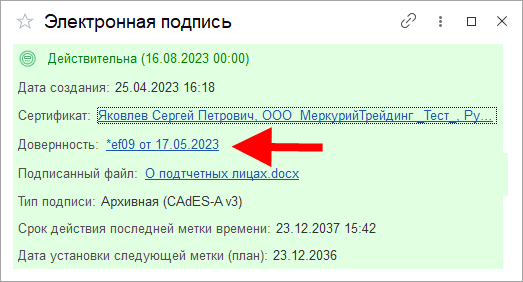 Если электронная подпись выполнена по доверенности, ссылка на доверенность будет отображаться в карточке ЭП.