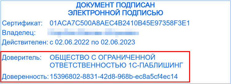 Если электронная подпись выполнена по доверенности, то при формировании штампа этой ЭП будет отображаться доверитель и номер доверенности.