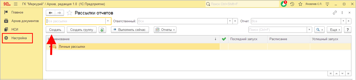 Посмотреть текущие рассылки отчетов и создать новые можно по команде Рассылки отчетов в меню раздела Настройка.