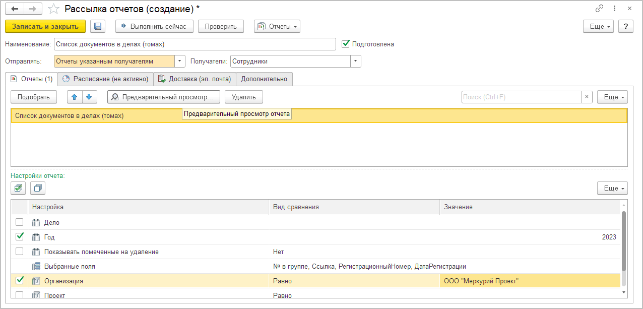 На этой закладке можно выбрать для рассылки один или несколько отчетов из списка с помощью кнопки Подобрать. С помощью кнопки Предварительный просмотр можно сформировать выбранный отчет. С помощью флажков таблицы Настройки отчета можно выбрать нужные настройки и указать значения, по которым будет выведен отчет.