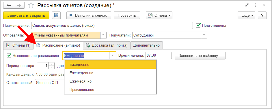 Для автоматической отправки отчетов с произвольным интервалом или по определенным дням недели можно создать расписание и установить флажок Выполнять по расписанию. При этом на основании каждой рассылки отчетов в программе формируются одноименные регламентные задания Рассылка отчетов.