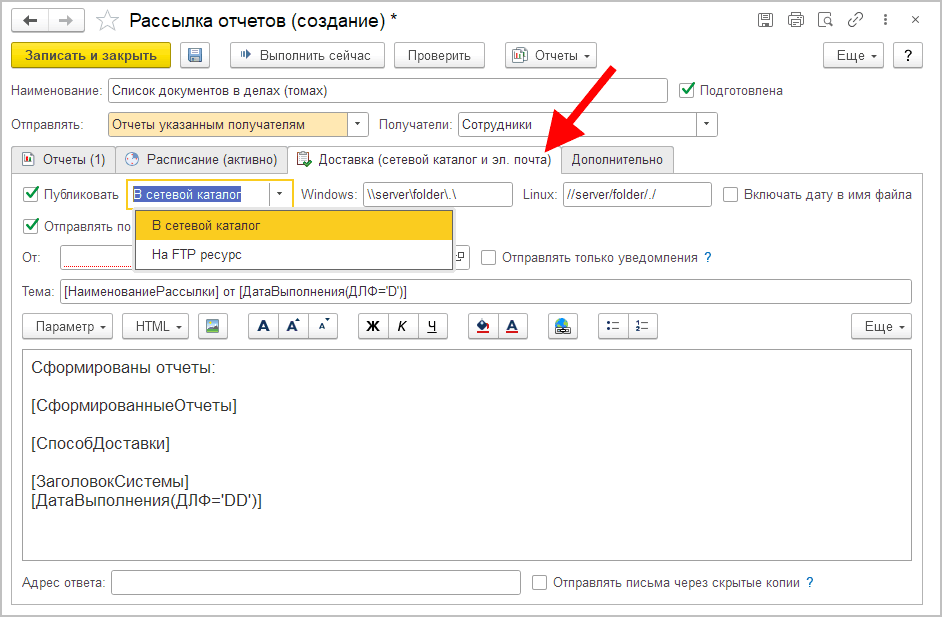 ■ Если выбраны Отчеты указанным получателям, то кроме доставки по почте появляется возможность опубликовать готовые отчеты.