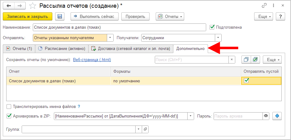Для архивации сформированных отчетов в формате ZIP необходимо установить соответствующий флажок. Рекомендуется включать архивацию, если отчеты отправляются по электронной почте, для снижения объема вложений. Наименование архива формируется автоматически по указанному в поле шаблону.