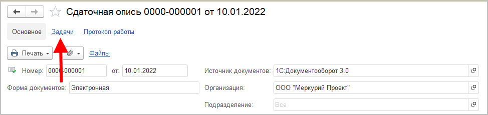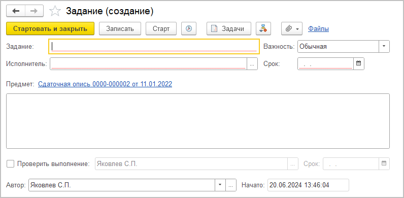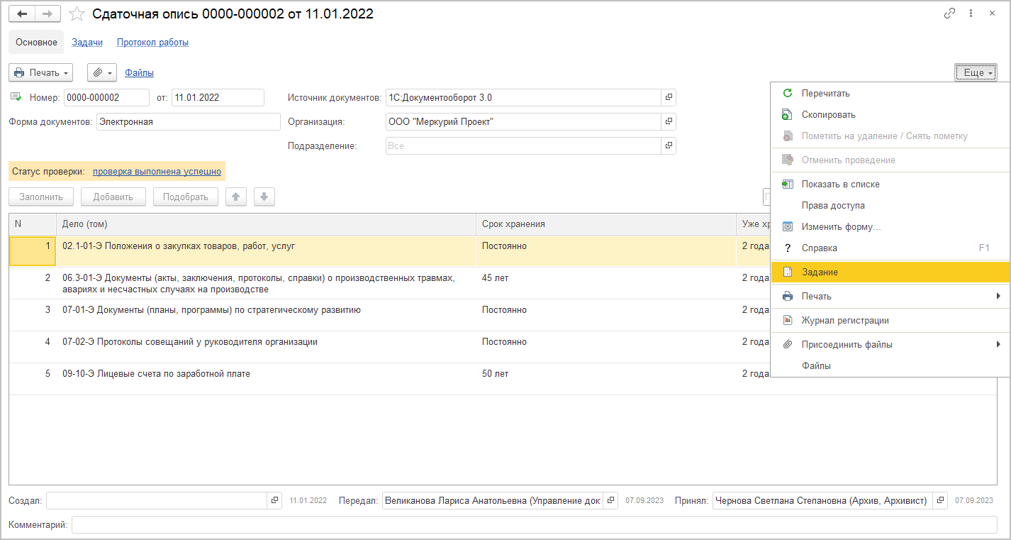 Создать задачу вручную можно из карточек документов Сдаточная опись и Пакет документов командой Задание в меню Еще.