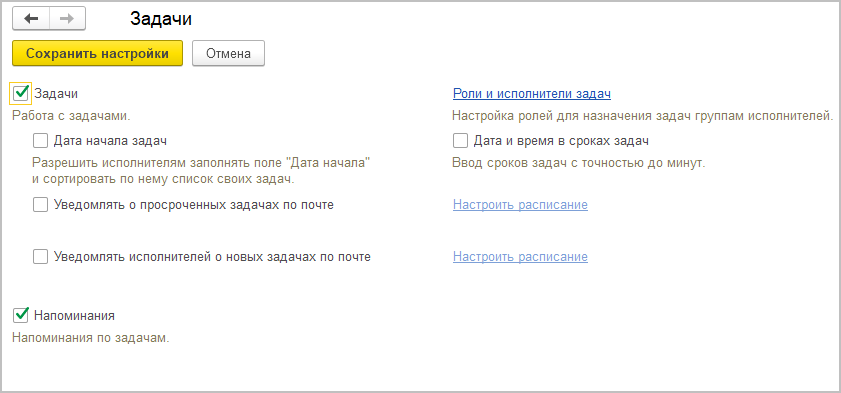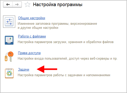 Настройка работы с задачами выполняется в разделе Настройка по ссылке Задачи.