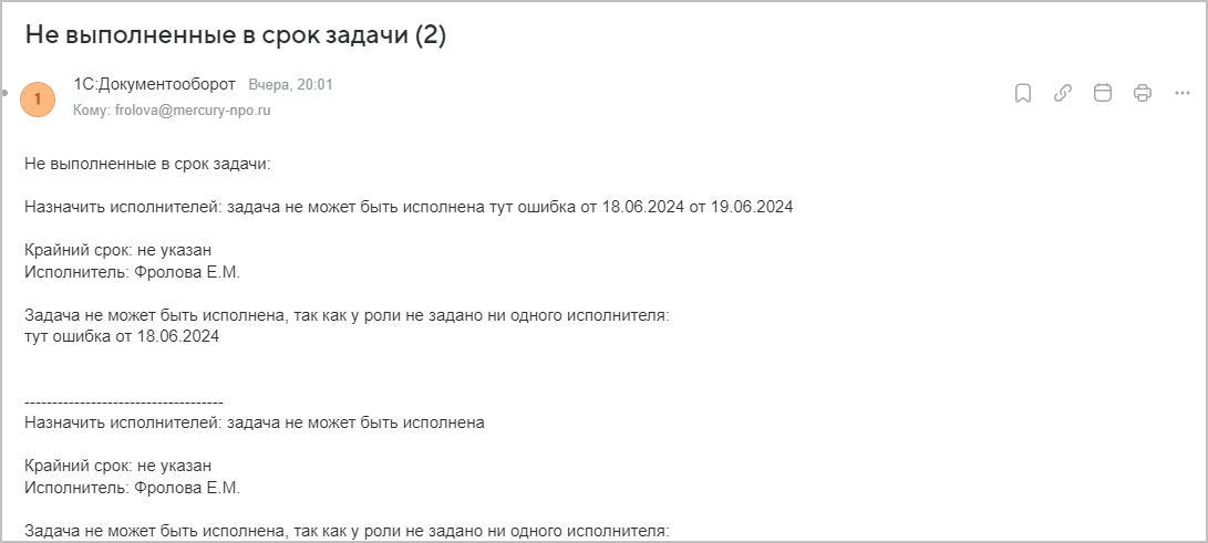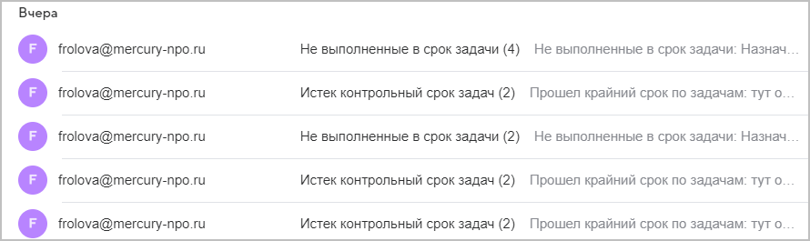 ■ Исполнитель у задачи указан, но он не выполняет ее – в этом случае программа отправляет исполнителям и координаторам выполнения задач уведомления о просроченных задачах по электронной почте.