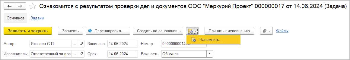 Напоминание по задаче можно создать вручную. Для этого в карточке задачи предусмотрена команда Напомнить.