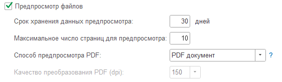 Для выполнения предпросмотра средствами платформы «1С:Предприятие» в настройке Способ предпросмотра PDF достаточно выбрать вариант PDF-документ.