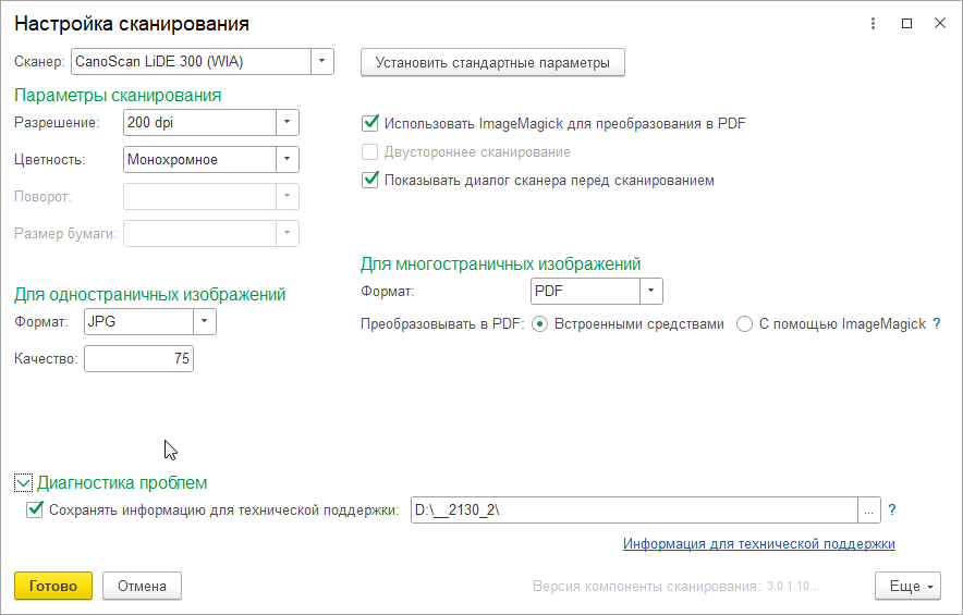 Работа компоненты сканирования теперь логируется, при проблемах можно отправить ZIP-файл со всем данными, используя гиперссылку Информация для технической поддержки.