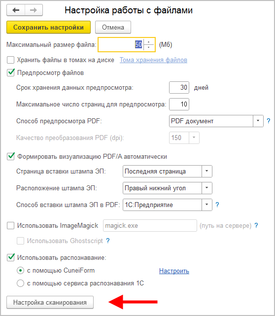 После обновления 1С:Архива на версию 1.0.8 по умолчанию будут установлены следующие настройки «Работа с файлами»: