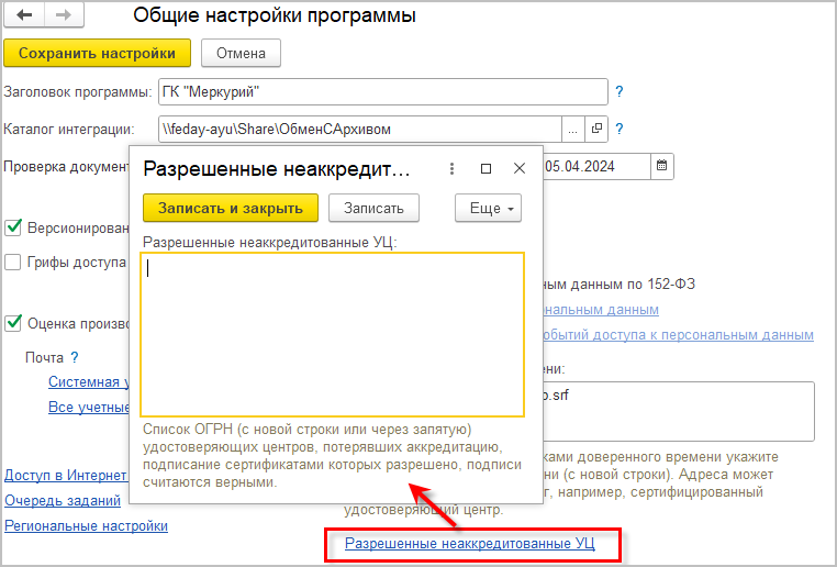 ■ Теперь в общих настройках программы можно указать Разрешенные неаккредитованные УЦ. В открывшемся окне с новой строки или через запятую указывается список ОГРН удостоверяющих центров, потерявших аккредитацию, подписи сертификатами которых считаются верными.